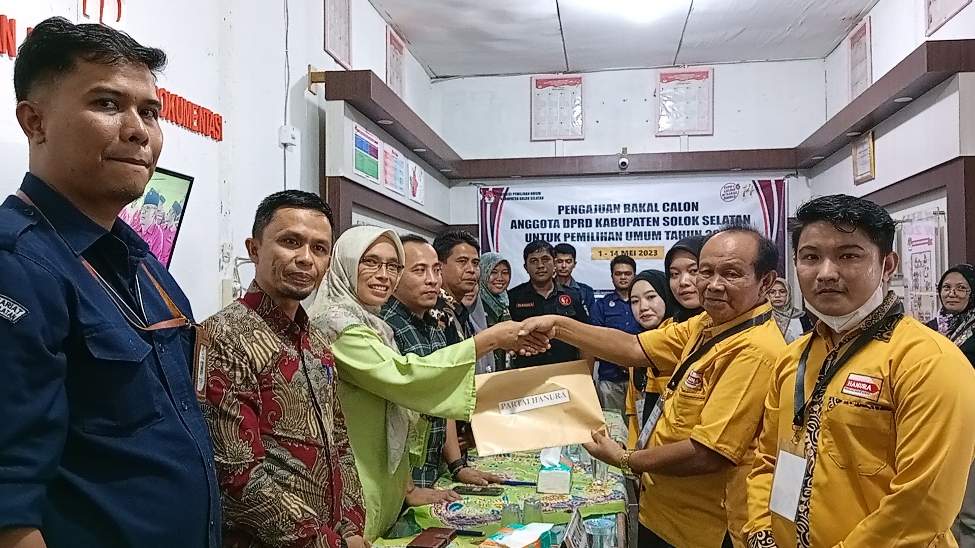 Partai Hanura mengajukan bakal calon sebanyak 25 (dua puluh lima) balon atau 100% kursi. Hasil pemeriksaan dinyatakan Lengkap dan Diterima, KPU Solok Selatan menyerahkan Tanda Terima Penerimaan Berkas pendaftaran dan Berita Acara.*)