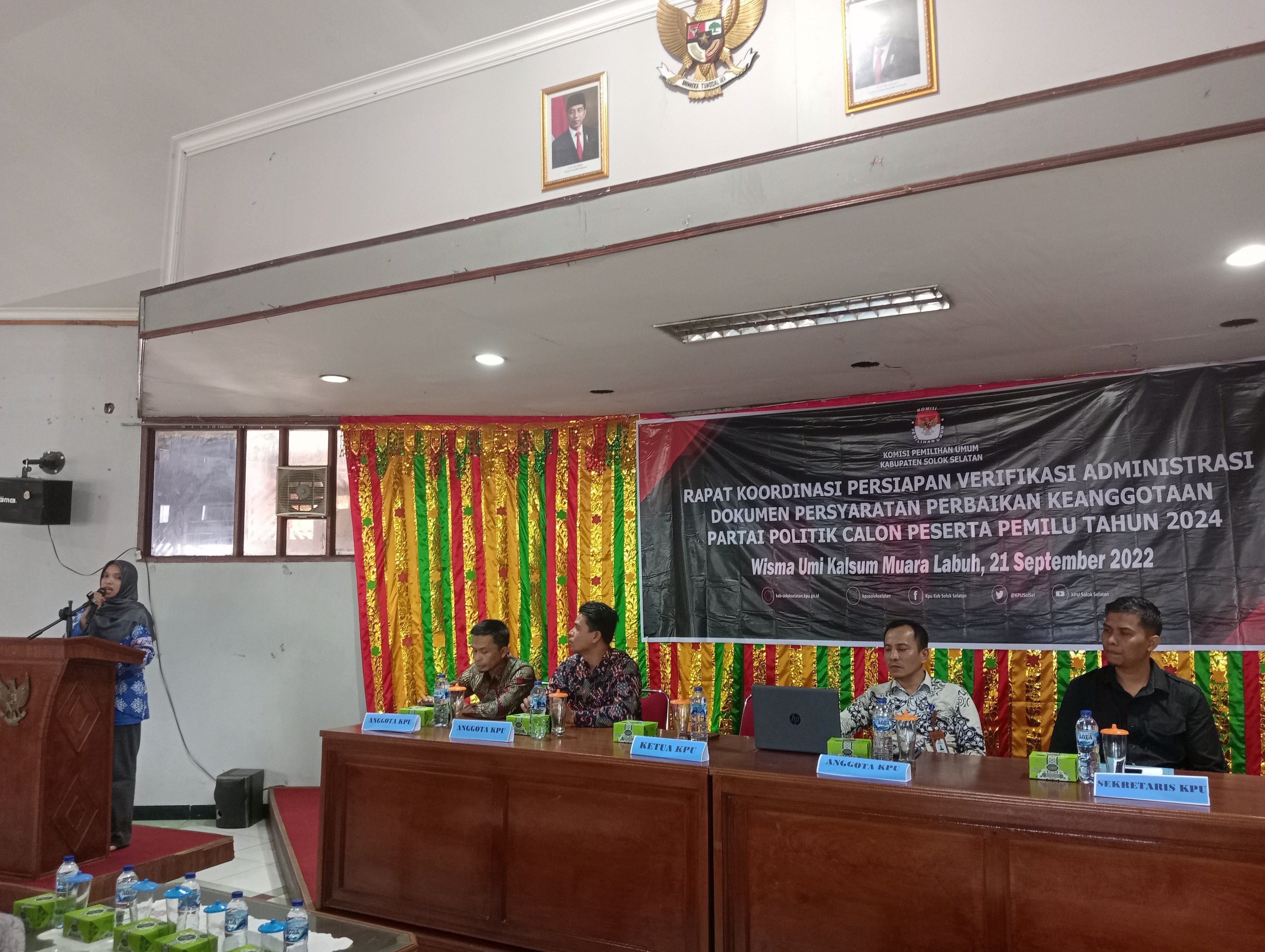 Muara Labuh, kab-solokselatan.kpu.go.id - Komisi Pemilihan Umum (KPU) Kabupaten Solok Selatan menyelenggarakan Rapat Koordinasi (rakor) Persiapan Verifikasi Administrasi Dokumen Persyaratan Perbaikan Keanggotaan Partai Politik Calon Peserta Pemilihan Umum Tahun 2024 di Wisma Umi Kalsum, Muara Labuh pada Rabu (21/9/2022). Kegiatan ini dihadiri oleh Polres Kabupaten Solok Selatan, Dandim Pabung 0309 Solok, Bawaslu Kabupaten Solok Selatan, Partai Politik dan undangan lainnya.
