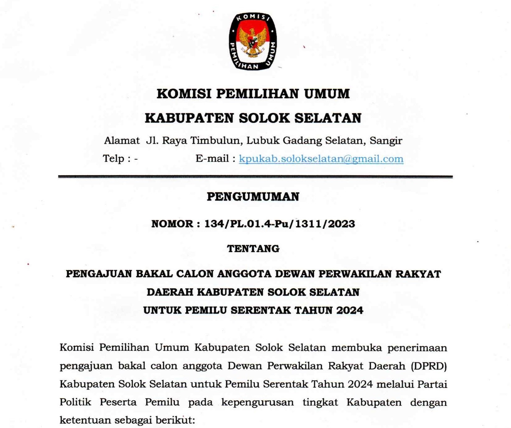 PENGUMUMAN NOMOR : 134/PL.01.4-Pu/1311/2023 TENTANG PENGAJUAN BAKAL CALON ANGGOTA DEWAN PERWAKILAN RAKYAT DAERAH KABUPATEN SOLOK SELATAN UNTUK PEMILU SERENTAK TAHUN 2024.