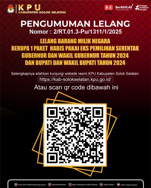 Komisi Pemilihan Umum Kabupaten Solok Selatan, akan melaksanakan Lelang Barang Milik Negara berupa Barang Habis Pakai Eks Pemilihan Gubernur dan Wakil Gubernur Tahun 2024, Bupati dan Wakil Bupati Tahun 2024 melalui perantara melalui kantor Pelayanan Kekayaan Negara Lelang (KPKNL) Padang dengan cara penawaran terbuka (Open Bidding) melalui internet