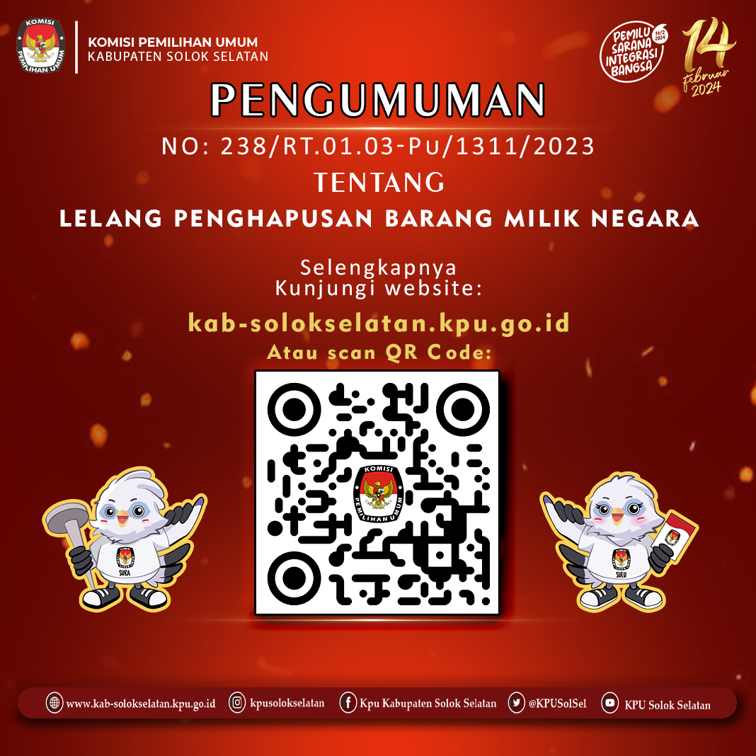 Sekretariat Komisi Pemilihan Umum (KPU) Kabupaten Solok Selatan melalui Kantor Pelayanan Kekayaan Negara dan Lelang (KPKNL) Padang, akan melaksanakan penjualan lelang Barang Milik Negara (BMN) Eks. Logistik Pemilihan Umum dan Pemilihan melalui Aplikasi Lelang Internet (Closed Bidding) dengan penawaran tertulis tanpa kehadiran peserta lelang, terhadap : 1 (satu) paket barang eks. Pemilihan Umum dan Pemilihan berupa :