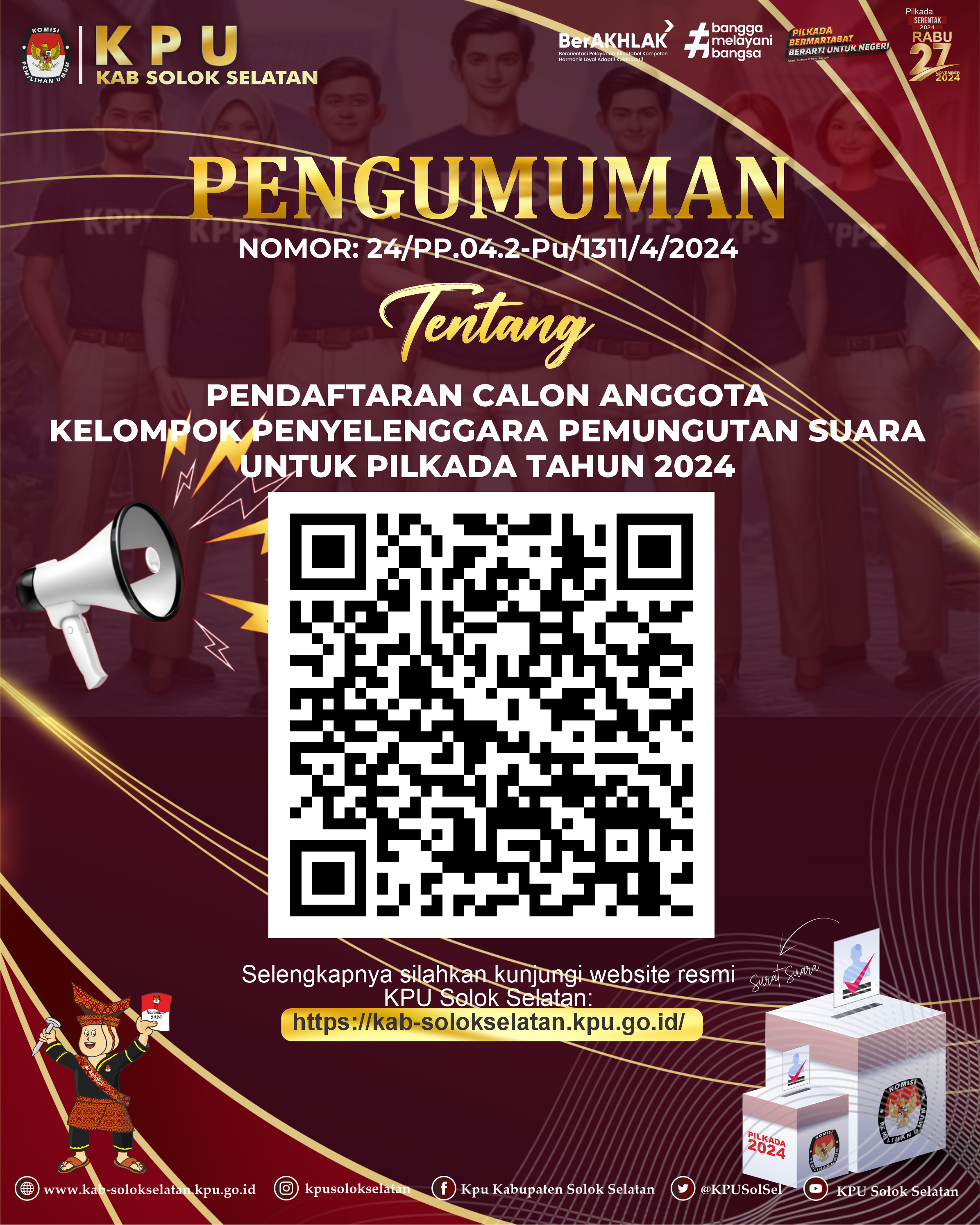 PENGUMUMAN PENDAFTARAN CALON ANGGOTA KELOMPOK PENYELENGGARA PEMUNGUTAN SUARA (KPPS) UNTUK PILKADA 2024 DI KABUPATEN SOLOK SELATAN
