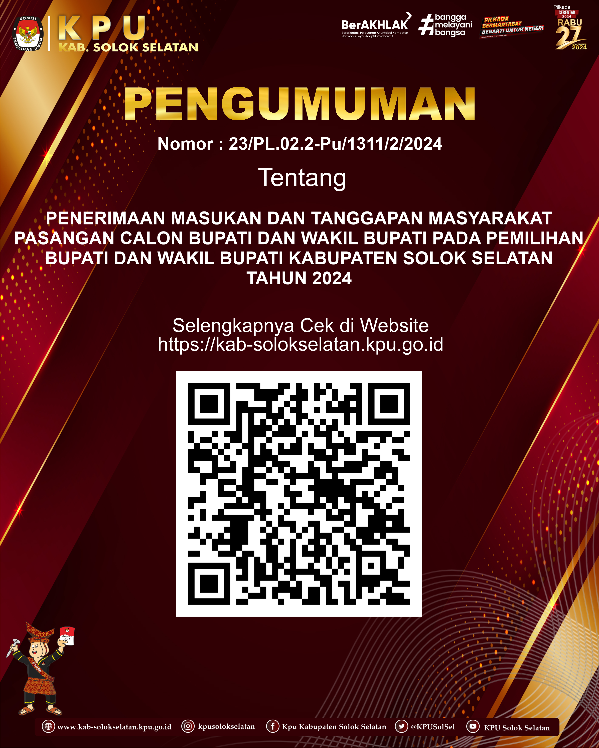 PENGUMUMAN PENERIMAAN MASUKAN DAN TANGGAPAN MASYARAKAT PASANGAN CALON BUPATI DAN WAKIL BUPATI PADA PEMILIHAN BUPATI DAN WAKIL BUPATI KABUPATEN SOLOK SELATAN TAHUN 2024