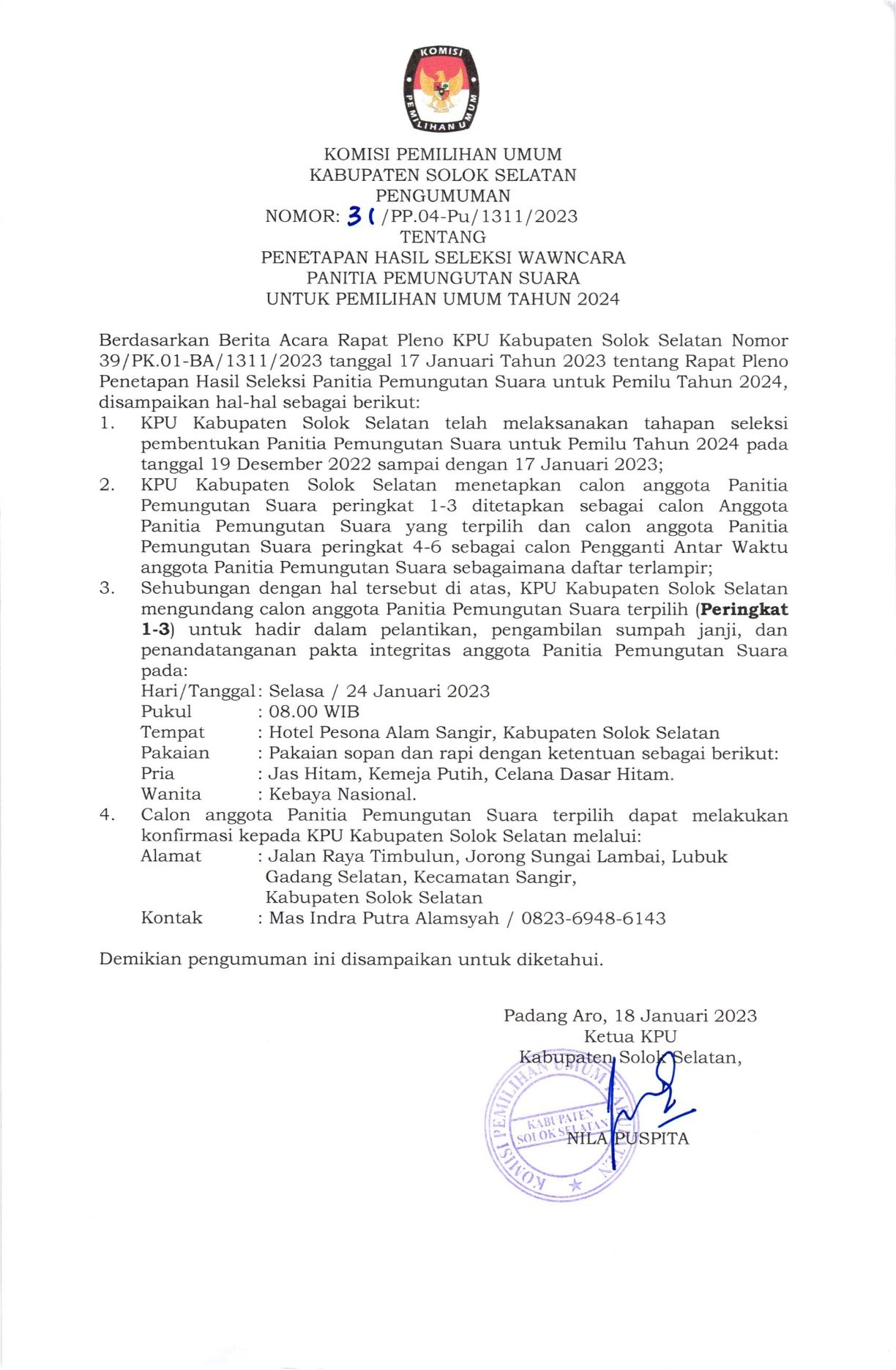 Berdasarkan Berita Acara Rapat Pleno Komisi Pemilihan Umum Kabupaten Solok Selatan Nomor 31/PP.04-Pu/1311/2023 tanggal 18 Januari 2023 tentang Penetapan Hasil Seleksi Wawancara Calon Anggota Panitia Pemungutan Suara (PPS) pada Pemilihan Umum Tahun 2024.