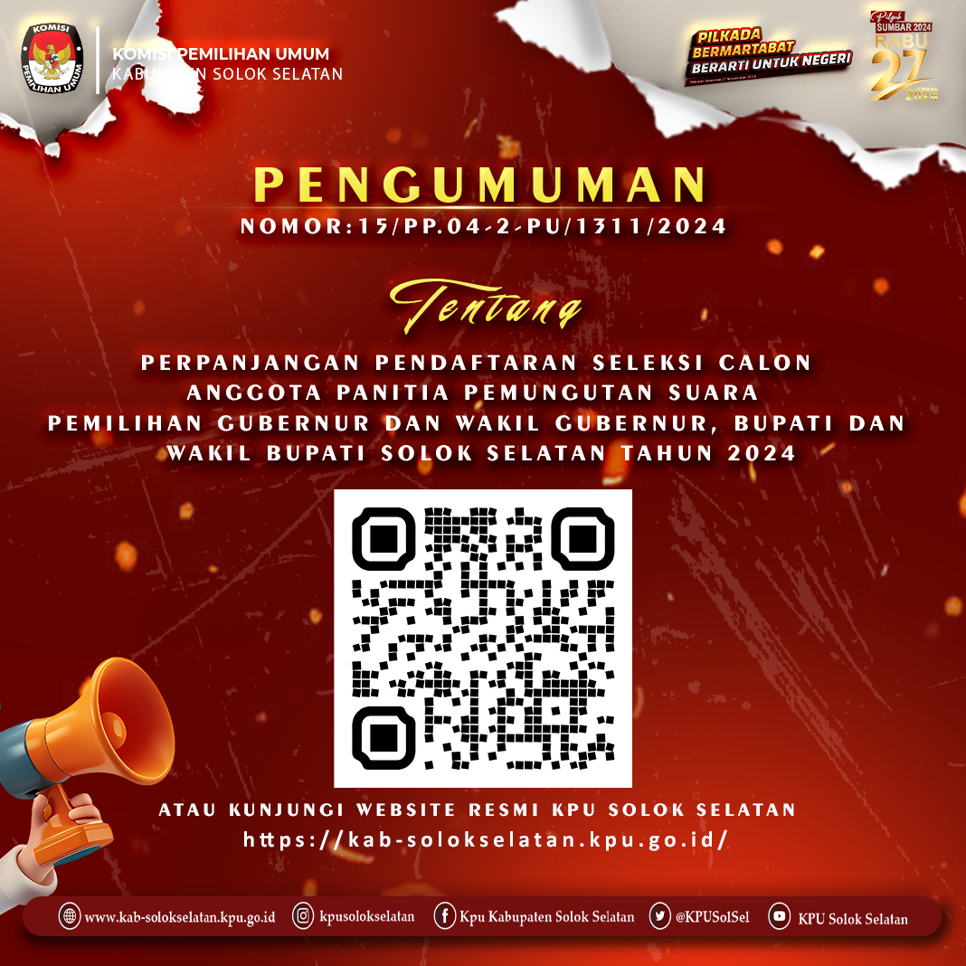 PENGUMUMAN PERPANJANGAN PENDAFTARAN SELEKSI CALON ANGGOTA PANITIA PEMUNGUTAN SUARA PEMILIHAN GUBERNUR DAN WAKIL GUBERNUR, BUPATI DAN WAKIL BUPATI SOLOK SELATAN TAHUN 2024