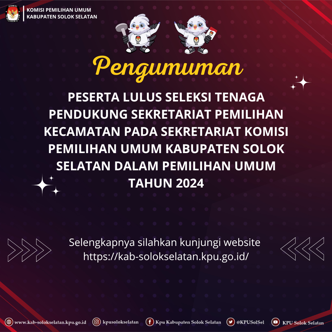 PENGUMUMAN NOMOR : 64/SDM.03.3/1311/2023 PESERTA LULUS SELEKSI TENAGA PENDUKUNG SEKRETARIAT PEMILIHAN KECAMATAN PADA SEKRETARIAT KOMISI PEMILIHAN UMUM KANIPATEN SOLOK SELATAN DALAM PEMILIHAN UMUM TAHUN 2024.