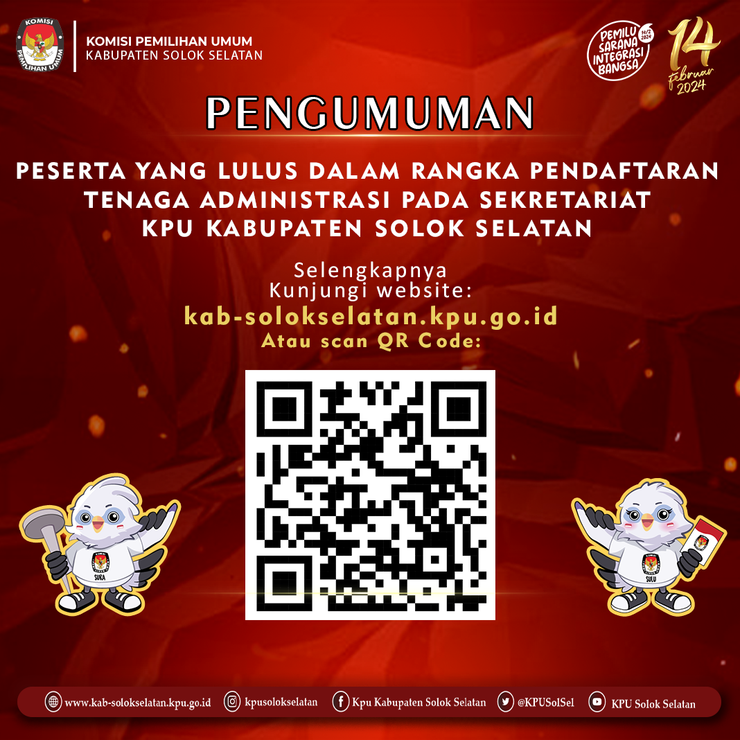 pengumuman peserta yang lulus dalam rangka tenaga pendaftaran tenaga administrasi pada sekretariat KPU Kabupaten Solok Selatan Sabtu, 09 Maret 2024 00:00 957 KLIK DISINI !! Bagikan: Dilihat 957 Kali.