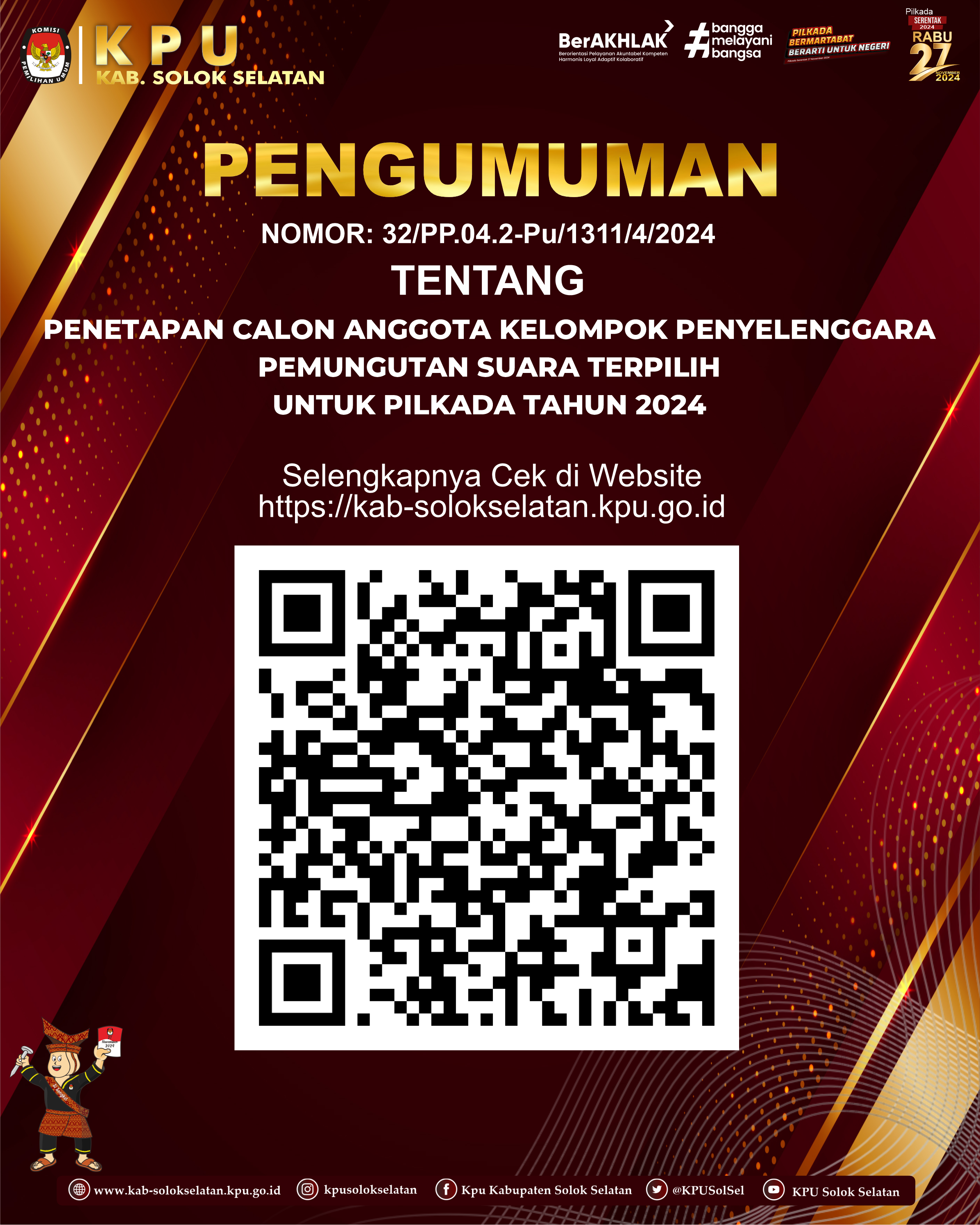 Berikut diumumkan Penetapan KPPS Terpilih untuk Pemilihan Gubernur dan Wakil Gubernur Sumatera Barat serta Bupati dan Wakil Bupati Solok Selatan Tahun 2024.
