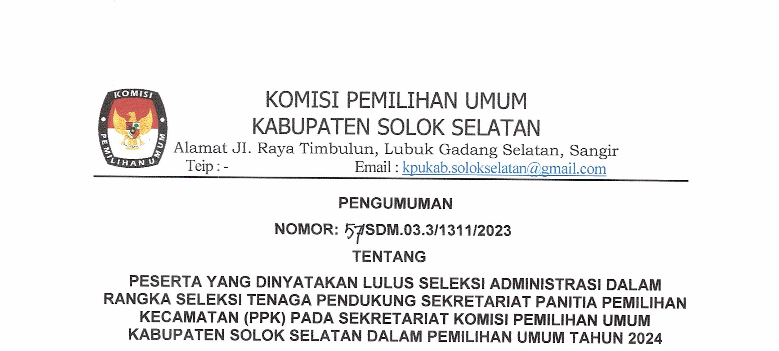 PENGUMUMAN TENTANG PESERTA YANG DINYATAKAN LLULUS SELKSI ADMINISTRASI DALAM RANGKA SELEKSI TENAGA PENDUKUNG SEKRETARIAT PANITIA PEMILIHAN KECAMATN (PPK) PADA SEKRETARIAT KOMISI PEMILIHAN UMUM KABUPATEN SOLOK SELATAN DALAM PEMILIHAN UMUM TAHUN 2024.