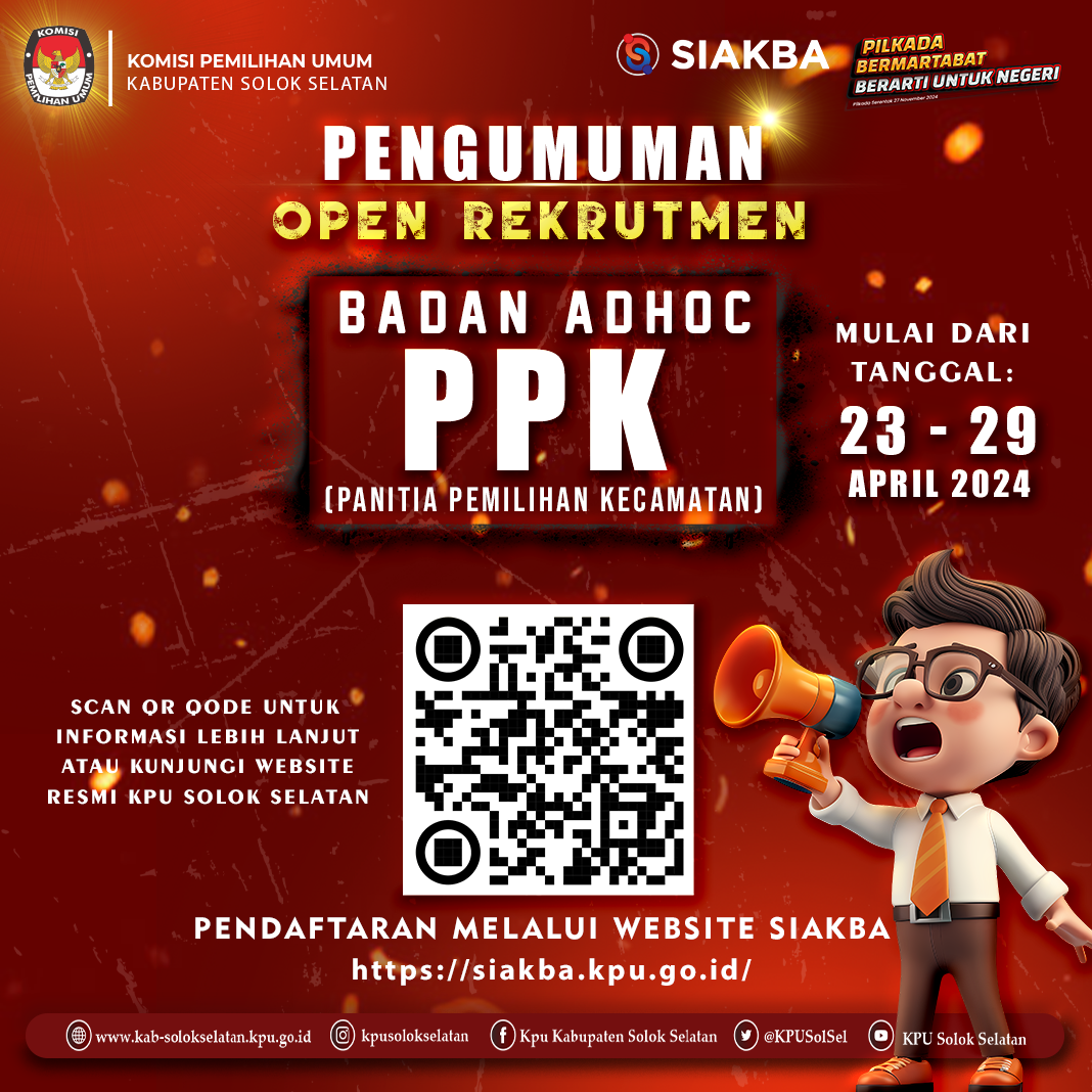 PENGUMUMAN TENTANG SELEKSI CALON ANGGOTA PANITIA PEMILIHAN KECAMATAN (PPK) UNTUK PEMILIHAN GUBERNUR DAN WAKIL GUBERNUR PROVINSI SUMATERA BARAT SERTA BUPATI DAN WAKIL BUPATI SOLOK SELATAN TAHUN 2024.