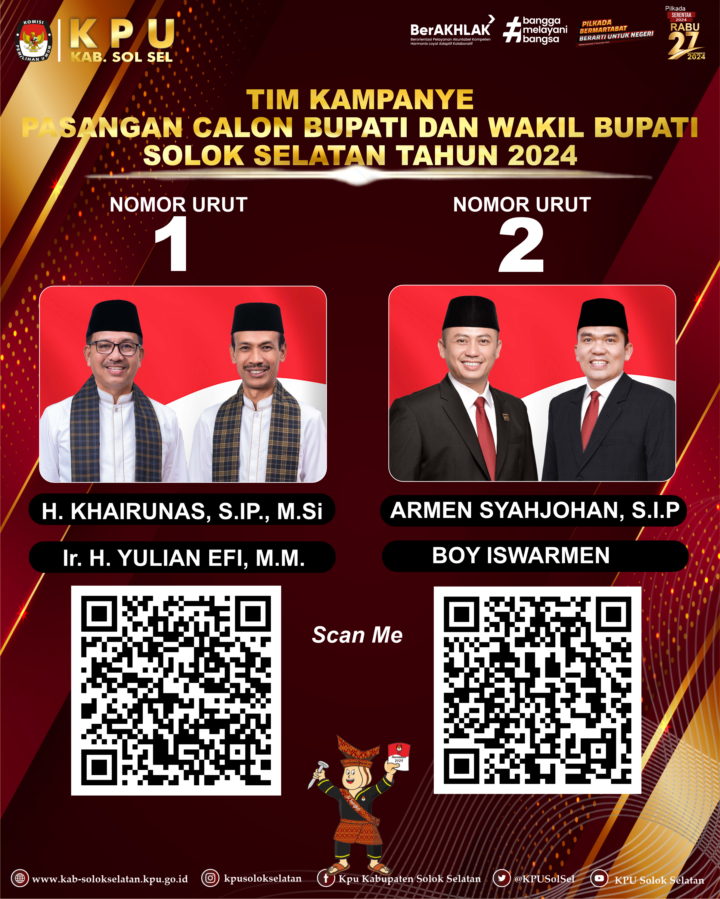 PENGUMUMAN TIM KAMPANYE PASANGAN CALON BUPATI DAN WAKIL BUPATI SOLOK SELATAN TAHUN 2024 Rabu, 25 September 2024 00:00 1034 1. KHAIRUNAS - YULIAN EFI 2. ARMEN SYAHJOHAN - BOY ISWARMEN Bagikan: Dilihat 1,034 Kali.
