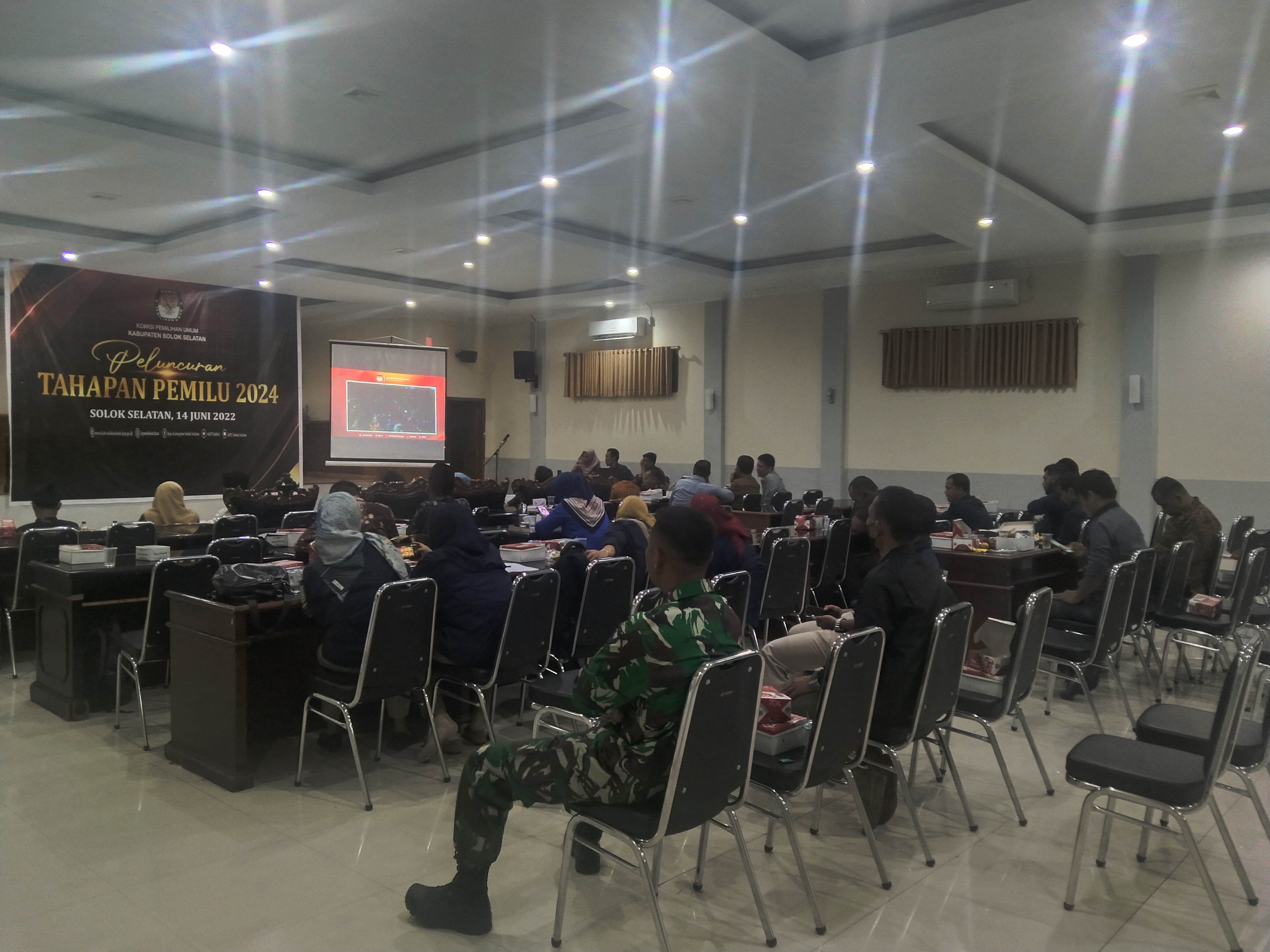 Padang Aro, kab-solokselatan.kpu.go.id - KPU Kabupaten Solok Selatan menggelar Nonton Bersama Peluncuran Tahapan Pemilu 2024 secara daring melalui zoom meeting mulai pukul 19.00 WIB. s/d selesai di Aula Hotel Pesona Alam Sangir, Selasa (14/06/2022).